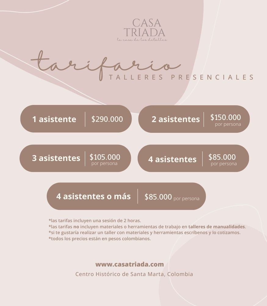 Podrás elegir tu taller favorito, en la fecha y hora que mejor funcione para ti. Para más información por favor compártenos tus datos de contacto y te ayudamos a organizar el taller que sueñas.