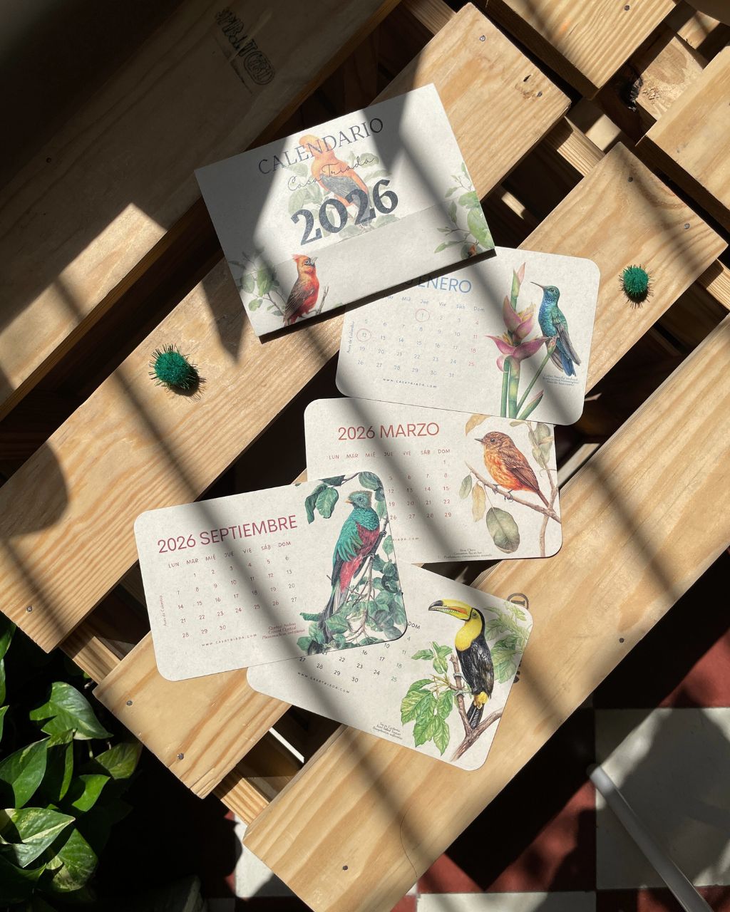 Cada calendario es un set de 6 tarjetas impresas a doble cara (12 meses), con un tamaño de 14.8 cm x 10.5 cm. Incluye un lindo empaque que funciona como soporte de escritorio.