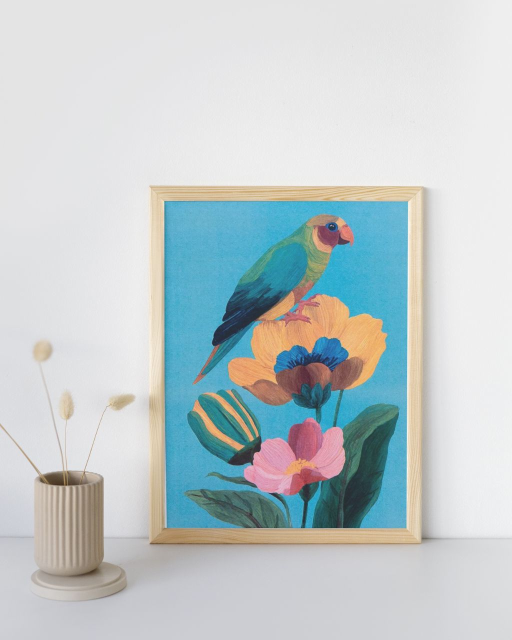 El póster Loro Cabeciazul presenta una ilustración vibrante de la Pionus menstruus sobre una base de flores ornamentales en tonos amarillos y rosados. Todo el conjunto resalta sobre un fondo azul turquesa profundo, creando una escena llena de luz y energía natural.